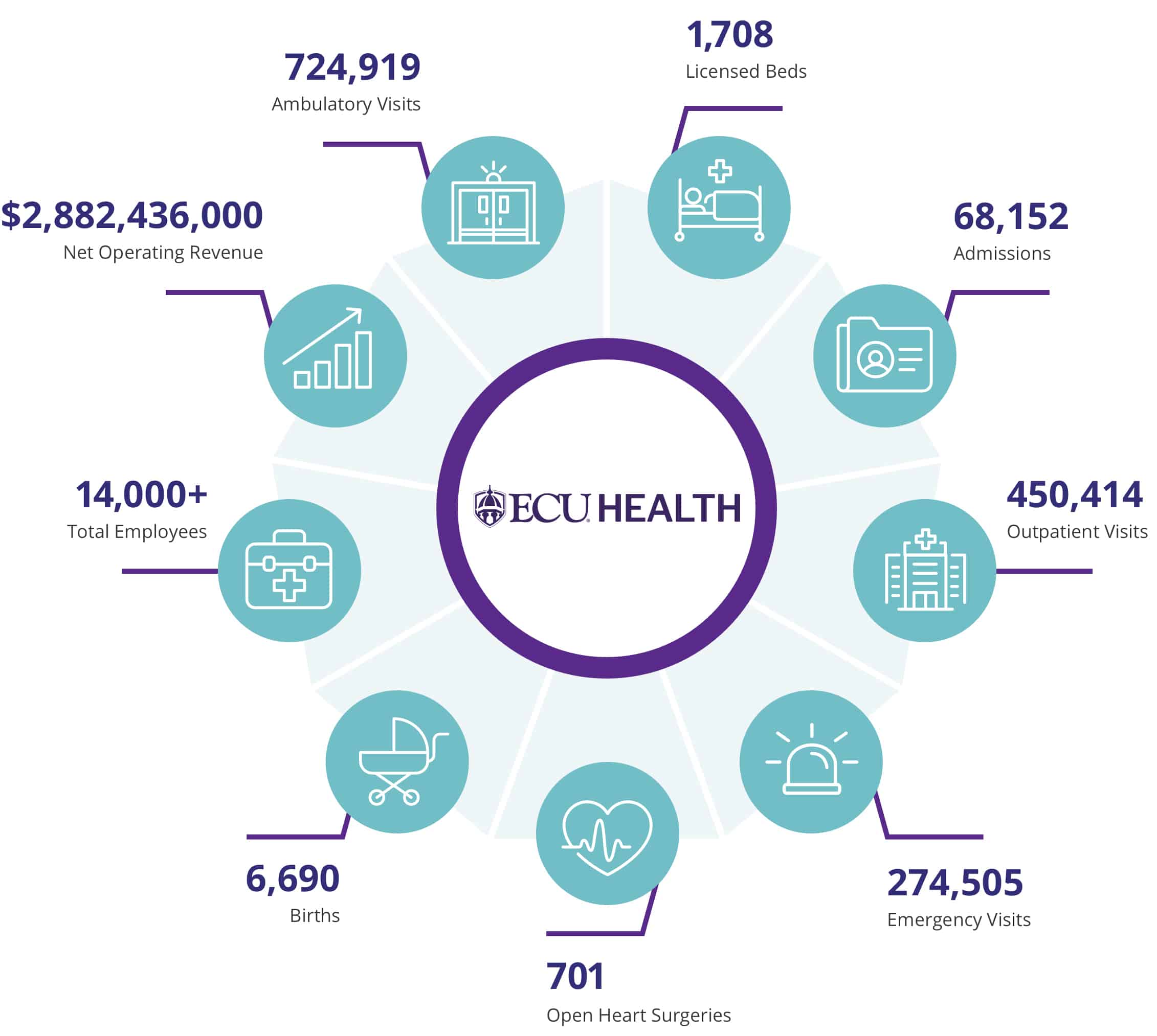 Across eastern North Carolina, we’re there for you. ECU Health’s system of care includes 1,708 beds across an academic medical center with two campuses, and is a teaching hospital for the Brody School of Medicine at East Carolina University; eight community hospitals; and numerous outpatient facilities, home health, hospice and wellness centers. The system has more than 1,200 academic and community providers practicing in more than 220 primary and specialty clinics located in more than 120 locations.