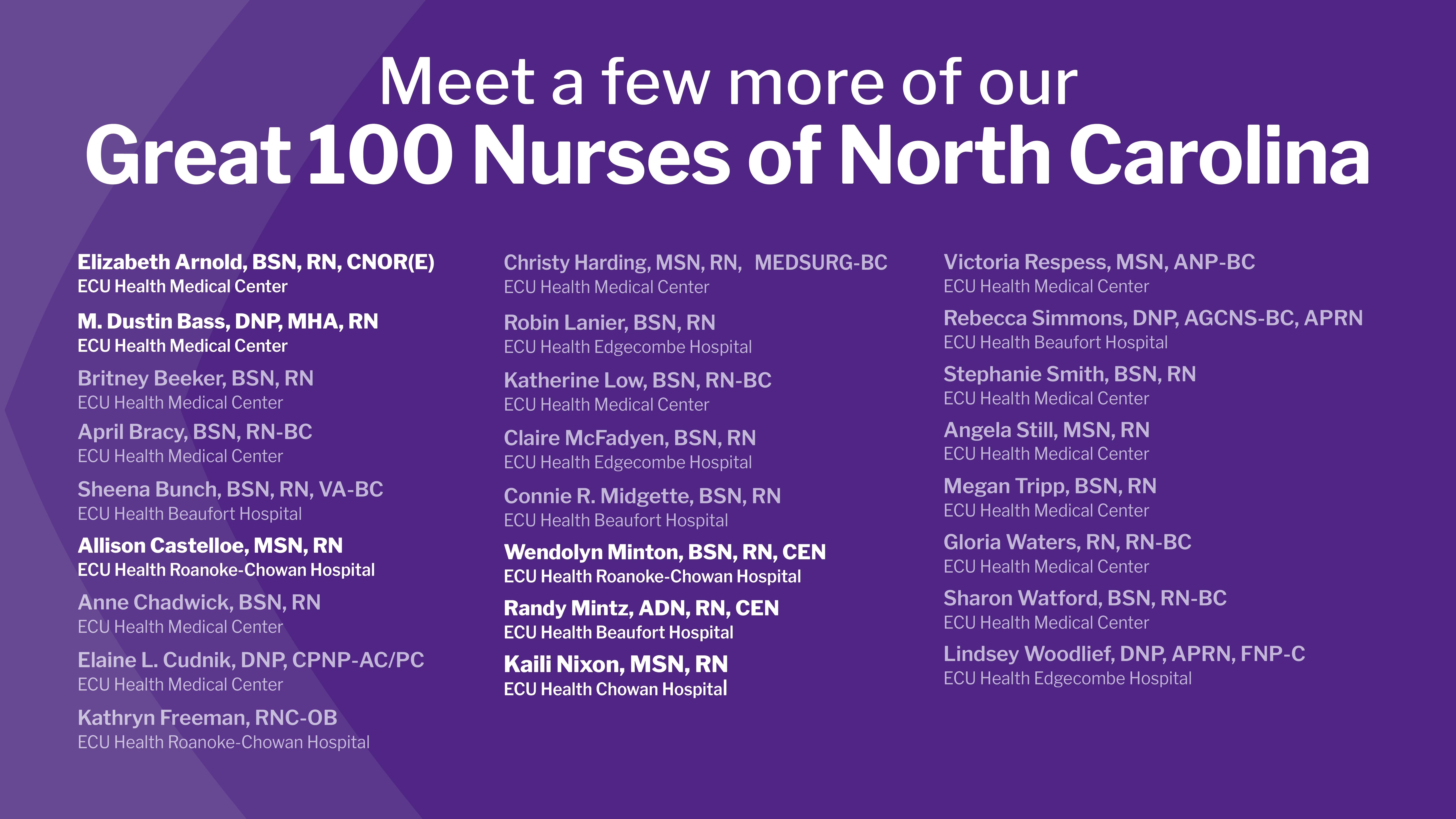 “With over 4,000 nurses across our system, ECU Health is proud to celebrate the exceptional caregivers who embody our mission to improve the health and well-being of eastern North Carolina,” said Trish Baise, chief nursing executive, ECU Health. “Each nurse honored in the Great 100, and those recognized in years past, represents the skill, compassion and advocacy that define our nursing team. Their dedication is a powerful affirmation of the extraordinary care our communities receive every day.”